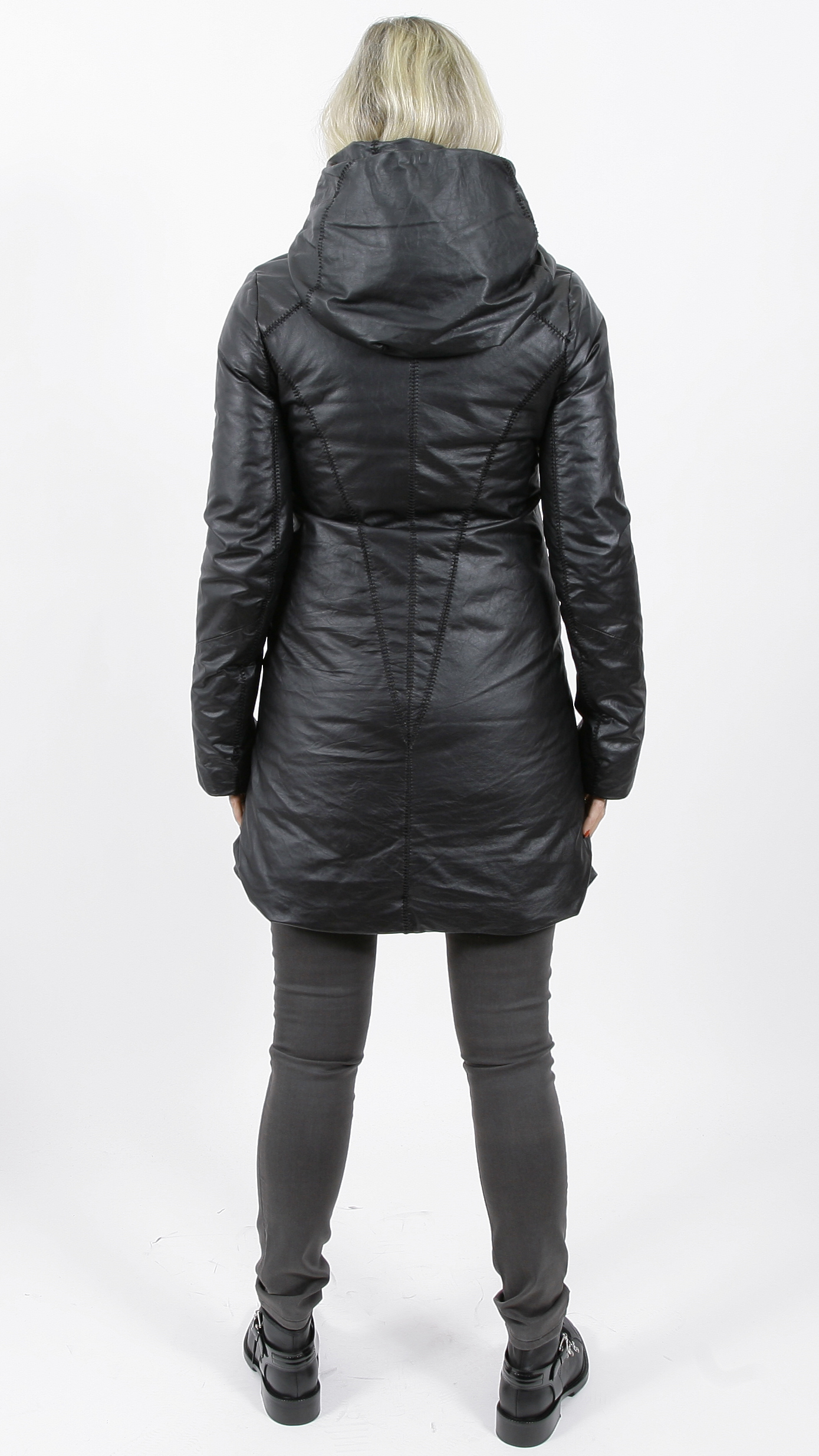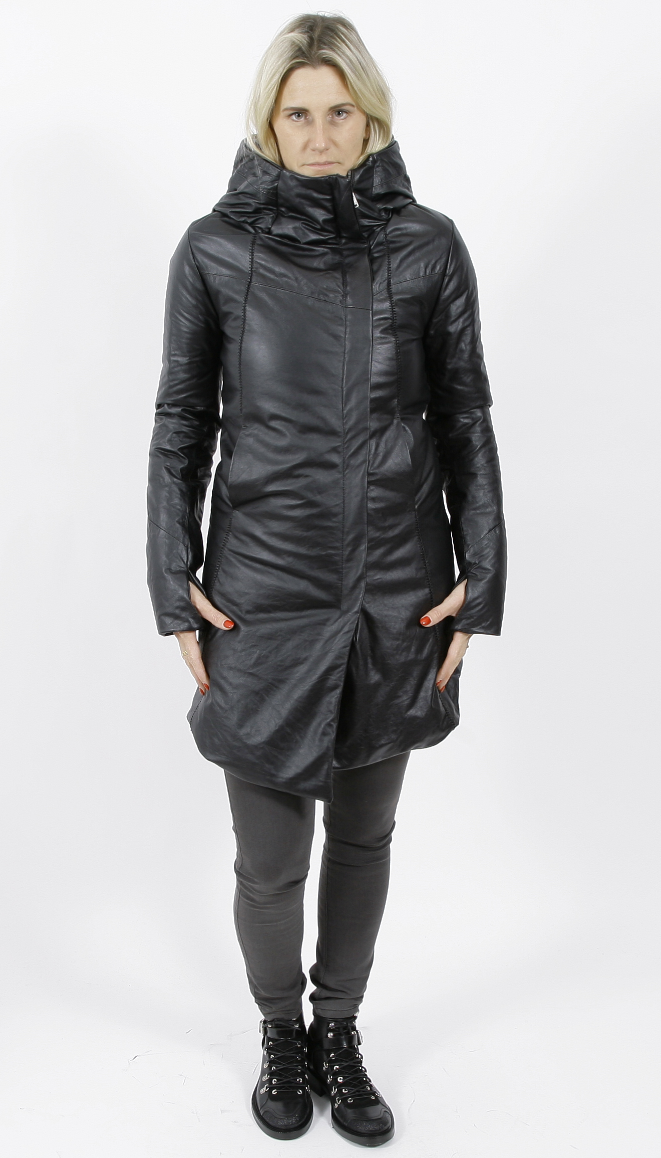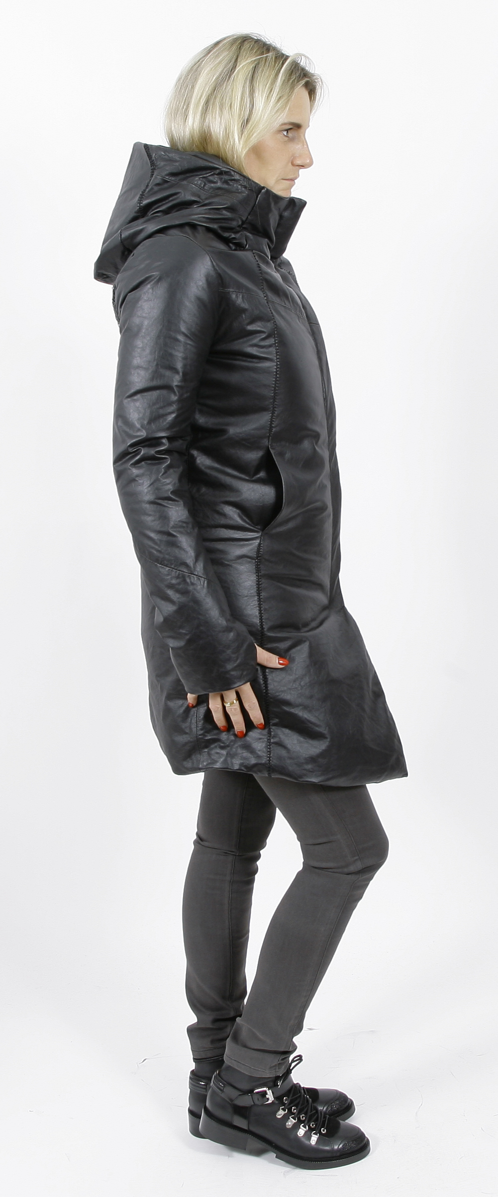10sei0otto Ledermantel mit schrägen Reißverschluss und Daunenfüllung.