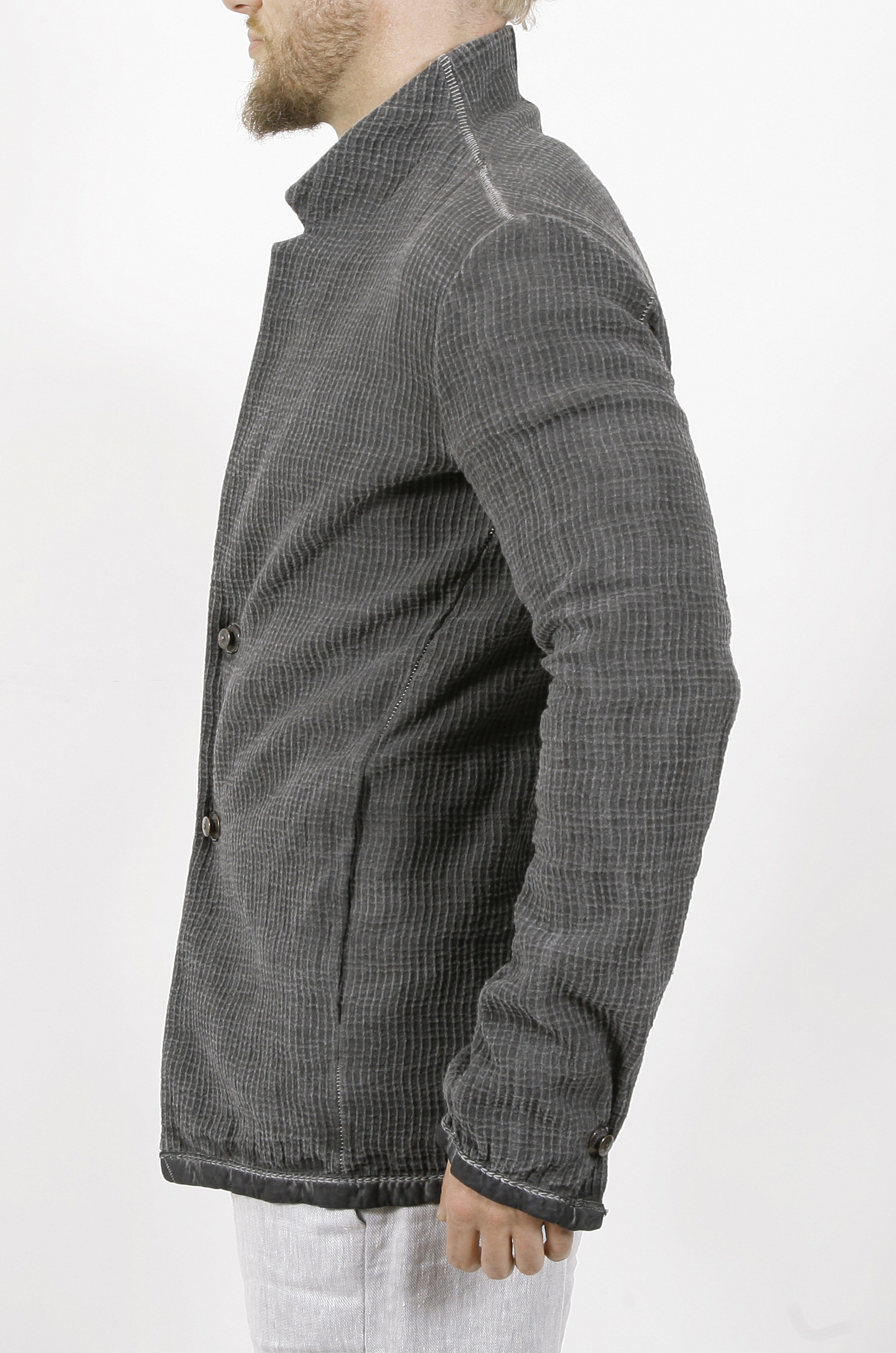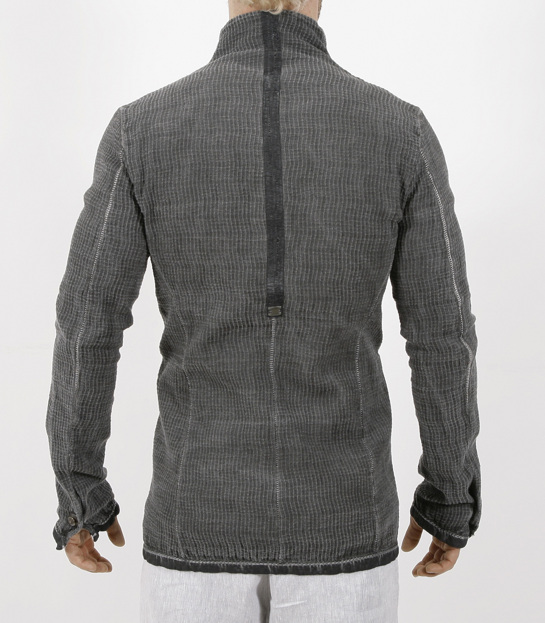 LONG LEATHER SPINE WITH SIGNATURE STAPLED 69 BY ISAACSELLAM ON BACK GARMENT COLD DYED IN COLORS AND WASHED IN PLOMB