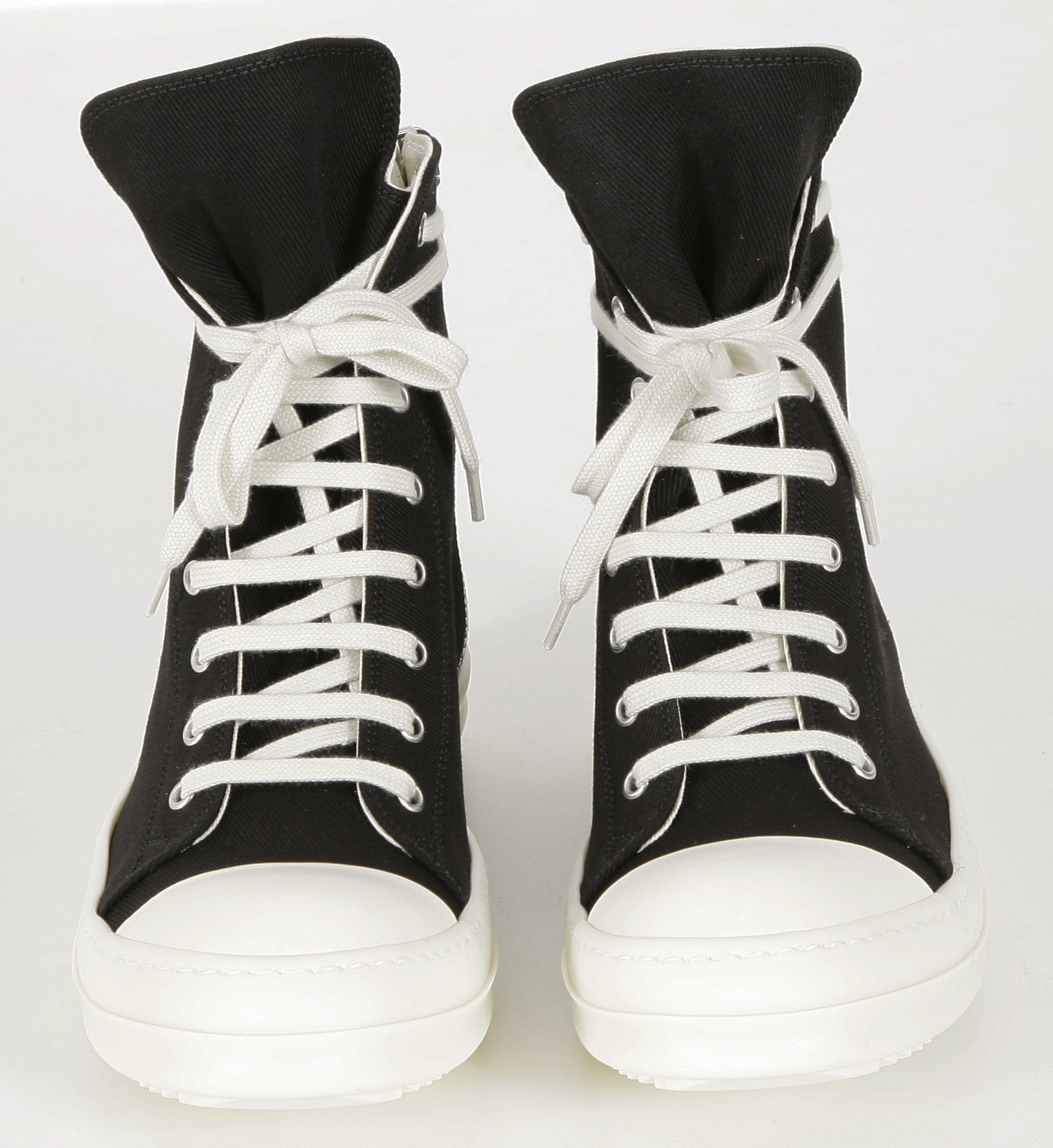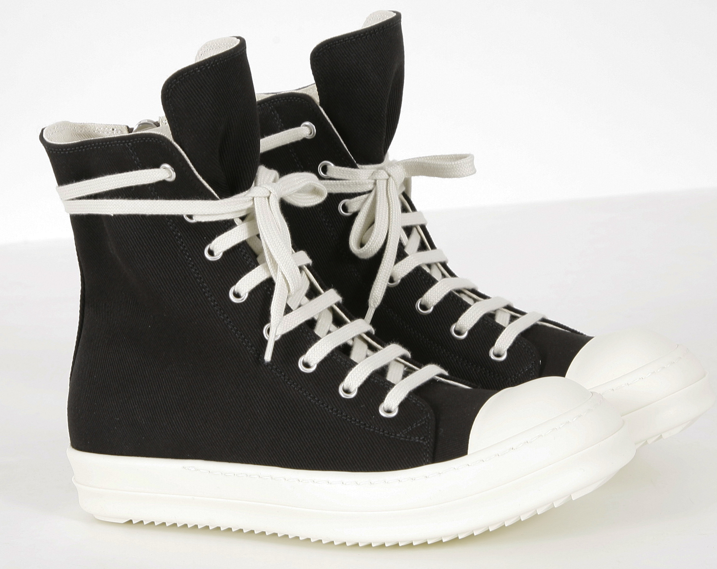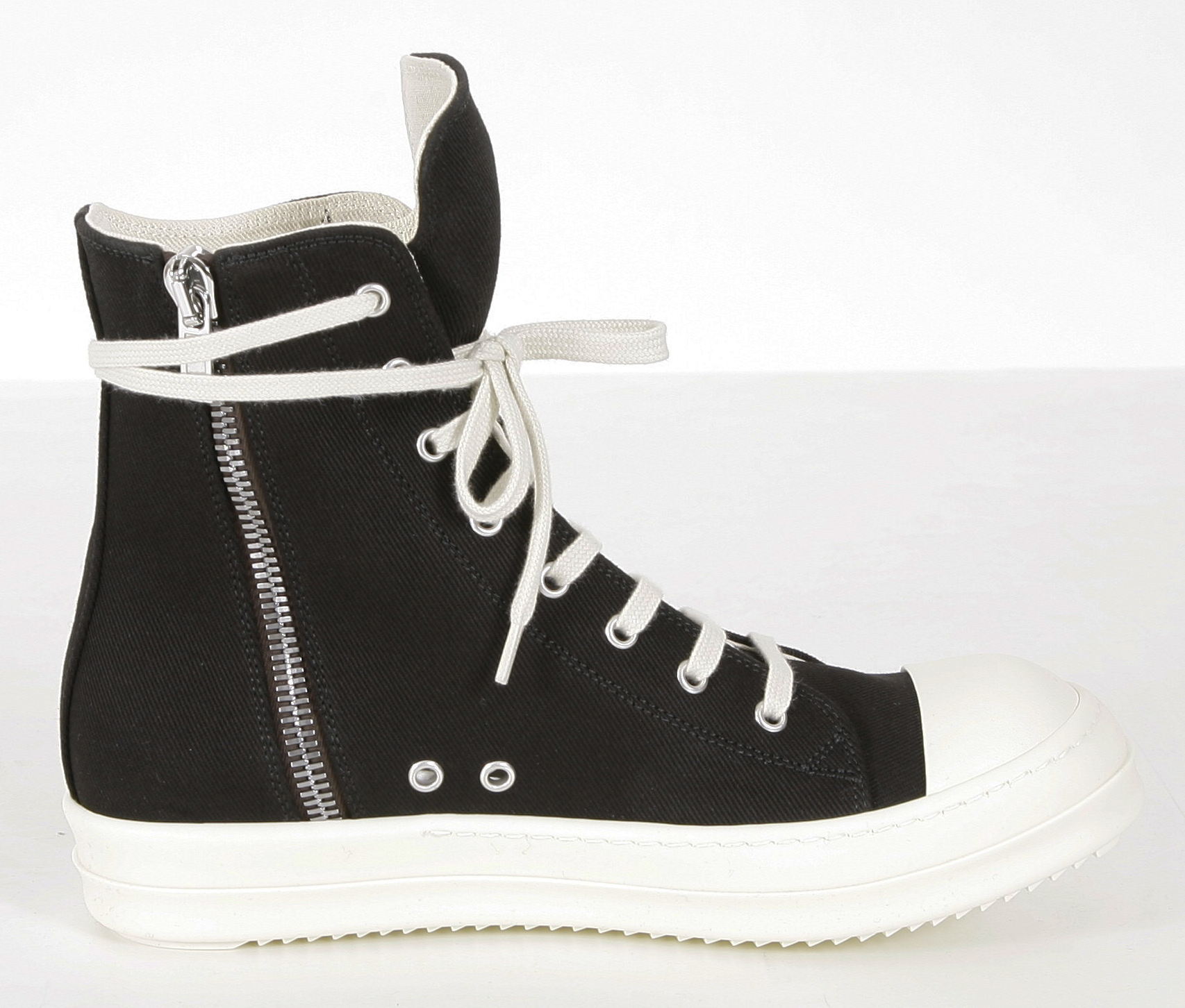THESE SNEAKS ARE ABOVE ANKLE HEIGHT AND FEATURE EIGHT EYELETS, LACES, A ZIPPER ON THE INSIDE ANKLE FOR EASY FASTENING, TOE CAPS AND SHARK TOOTH SOLES.