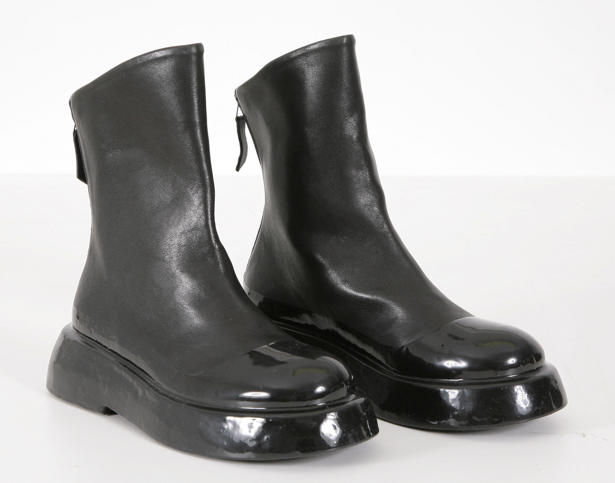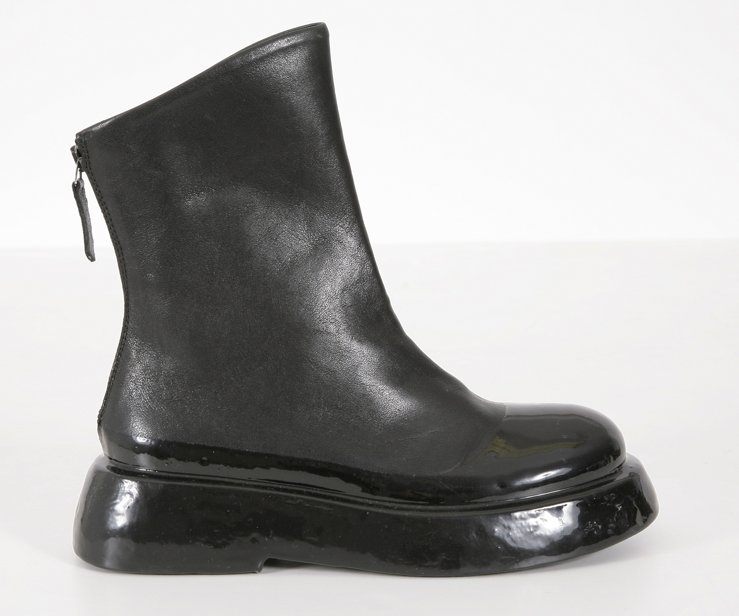 Boots aus feinem Leder mit leichter Sohle glänzend. Reißverschluss hinten. Die Schuhe fallen normal aus.